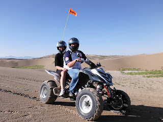 The next morning, we woke up bright and early and headed out on the 4wheelers. I had never ridden on one like this, and I think Joe has only gone out one other time with Joseph. I was a little scared riding with Joe because it made it harder for him to drive with me on the back and I didn't fully trust his abilities.=) I decided to switch drivers, and ride with Joseph because I knew he was much more experienced, and I didn't feel like dying at the Sand Dunes.=)This is me with Joe. |